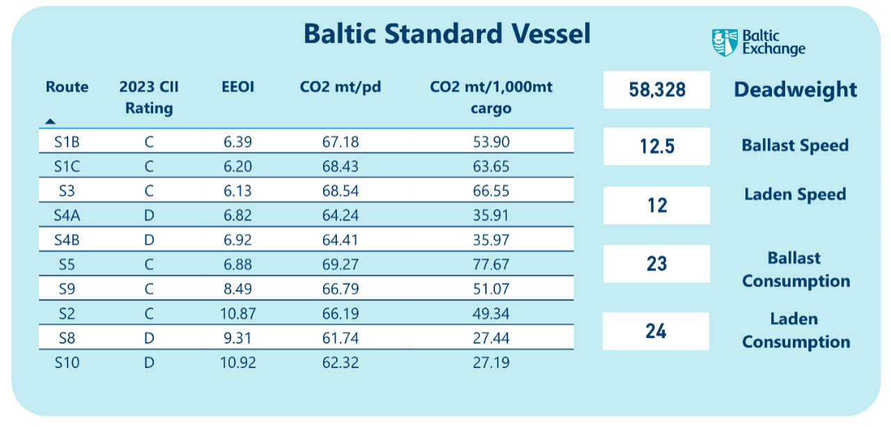 The block on the right-hand side displays the results for the standard Baltic ship on the Baltic standard routes. These standards are more fully described in the “Guide to market benchmarks” document or the route visualization page.
