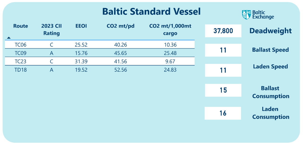 The block on the right-hand side displays the results for the standard Baltic ship on the Baltic standard routes. These standards are more fully described in the “Guide to market benchmarks” document or the route visualization page.
